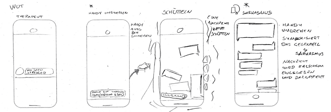Anger is translated into kinetic disruption. By shaking the device, a message transforms into an angry bubble. The physical gesture releases tension and visually communicates emotional intensity.