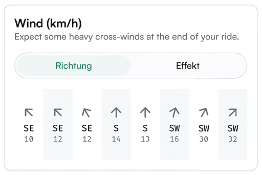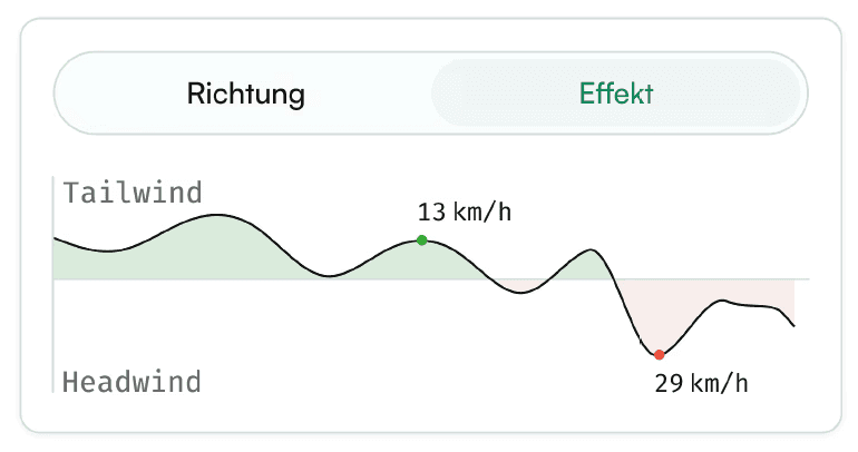 Wind plays a crucial role in cycling. The interface shows wind direction and speed along the route, while a line chart visualizes the effect: tailwind in green above the axis and headwind in red below, making it easy to spot supportive or challenging sections.