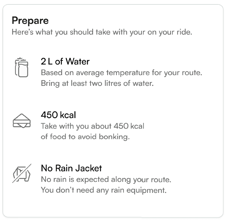 Another way we support users is by helping them prepare for their ride. In this section, we highlight the most important items to bring—tailored to the weather, route length, and intensity.