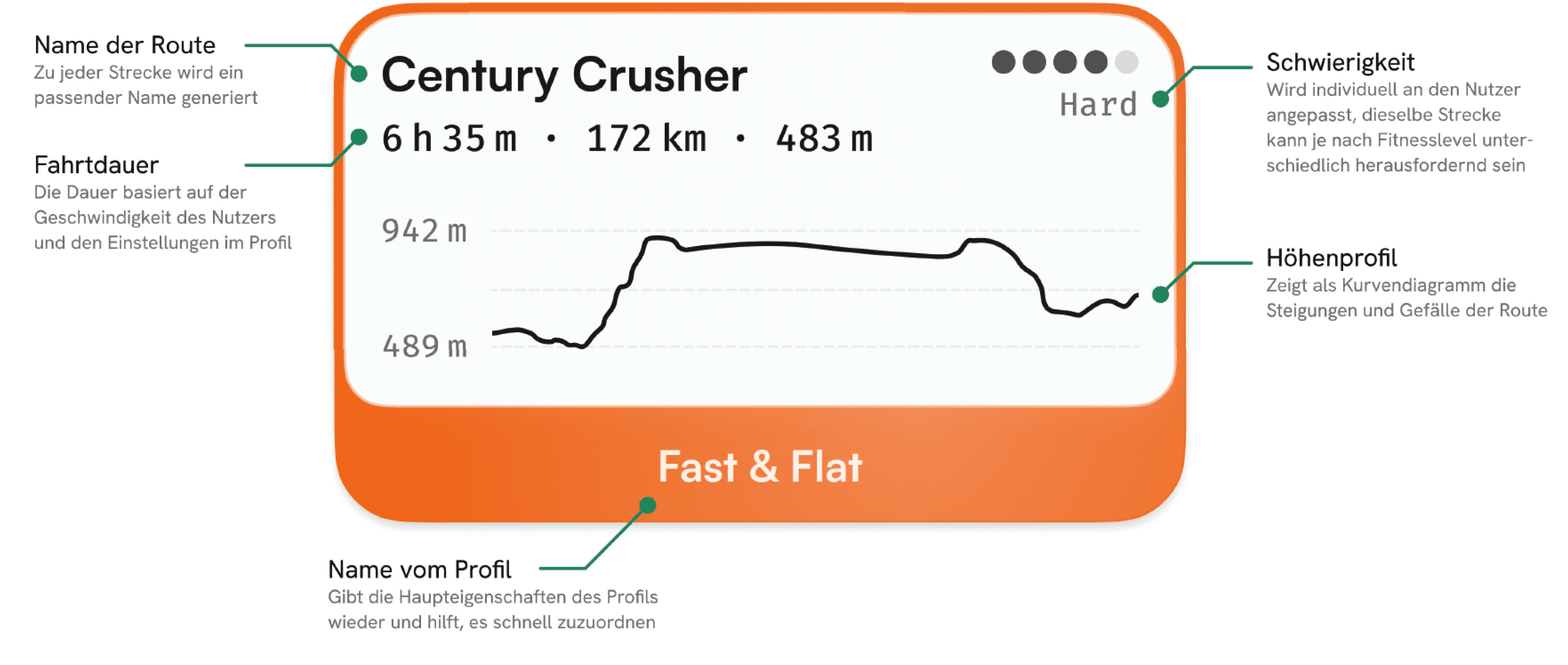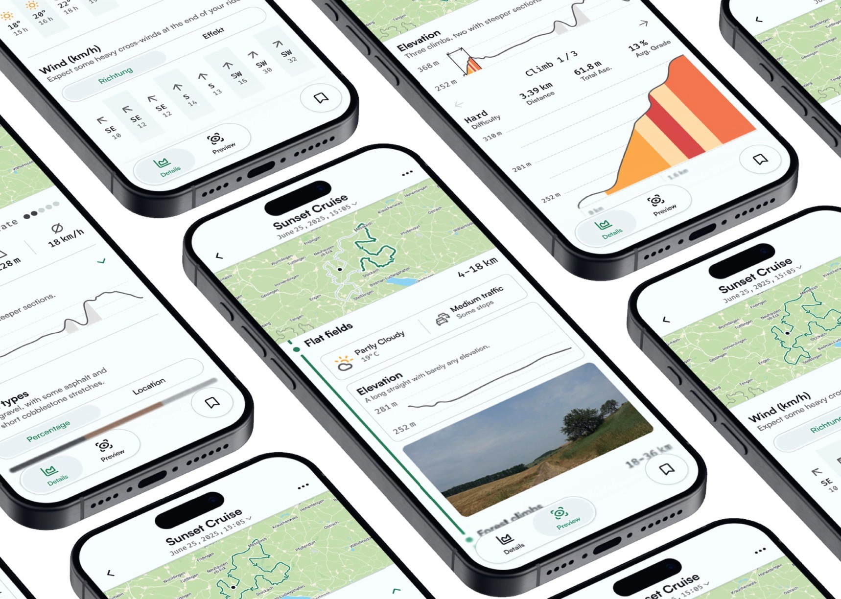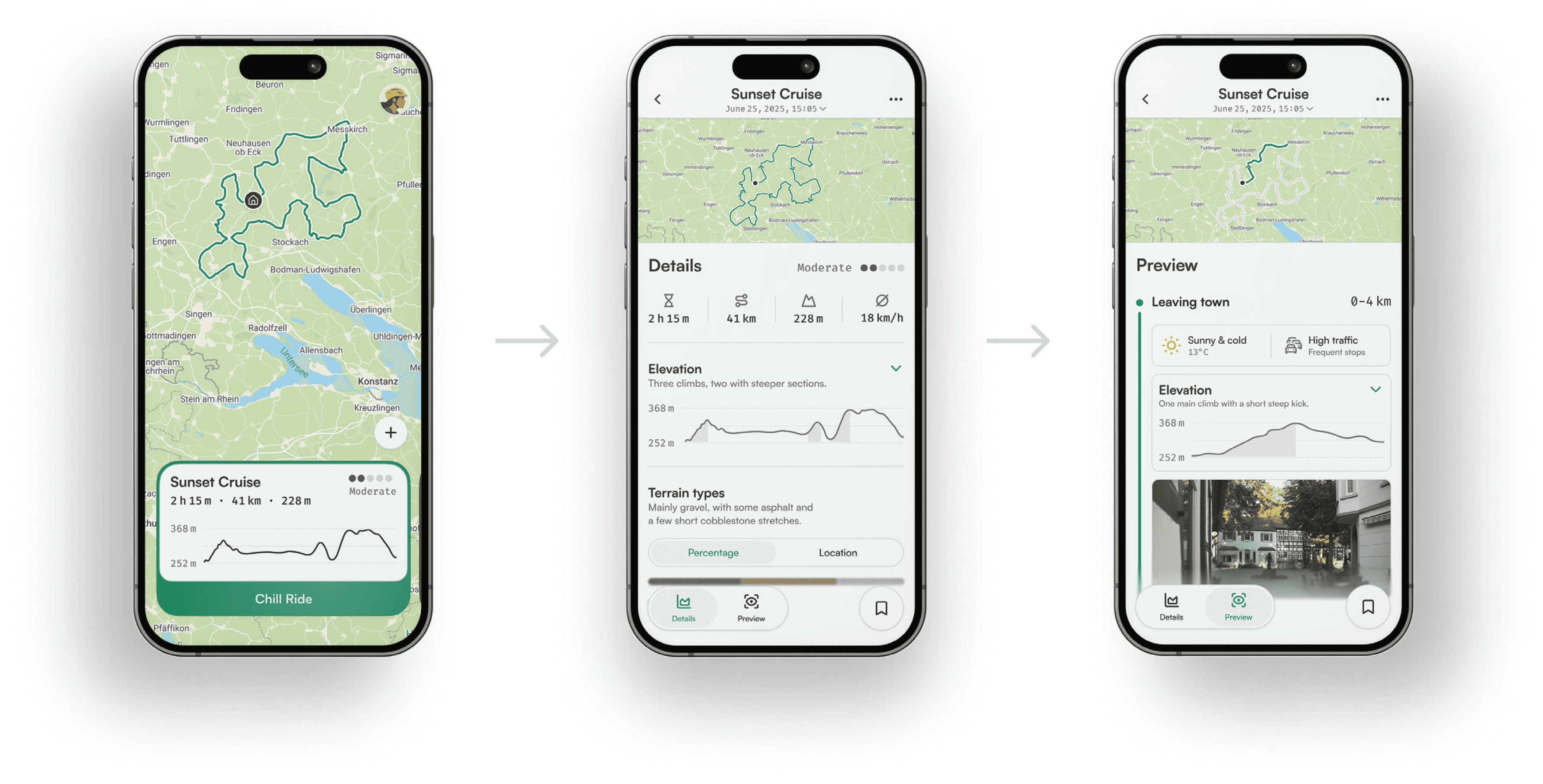 The concept focuses on day rides and loop routes, where preference-based routing creates the strongest user differentiation.