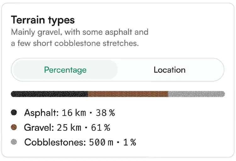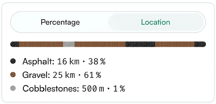 This view dynamically summarizes the route’s surface conditions. Sections are assigned to their respective ground types, so users can see exactly where each surface appears. A percentage breakdown gives a quick overview, while the legend adds precise distances and shares for every type.
