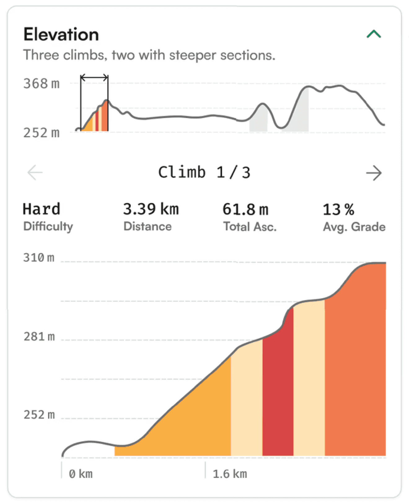 The elevation profile provides a quick overview of the route’s overall climb. Users can expand it to analyze individual segments, with key details such as difficulty, length, elevation gain, and average gradient displayed clearly and in our four gradient colors.